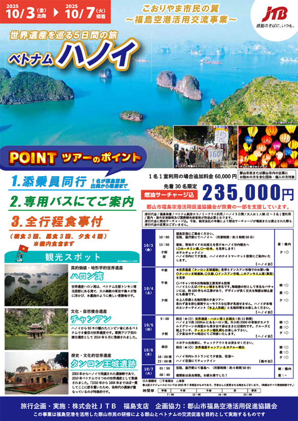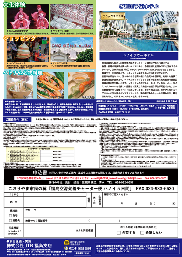 《本ツアーに関するお問い合わせ》 株式会社JTB 福島支店 TEL:024-932-0657 FAX:024-933-6620 Mail.jtb2294_fukushimaeigyo01@jtb.com