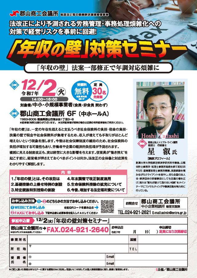 ①上記「申込方法」のURLから必要事項をご入力いただくか、またはチラシ下部に必要事項をご記入いただきFAXでお送りください。
