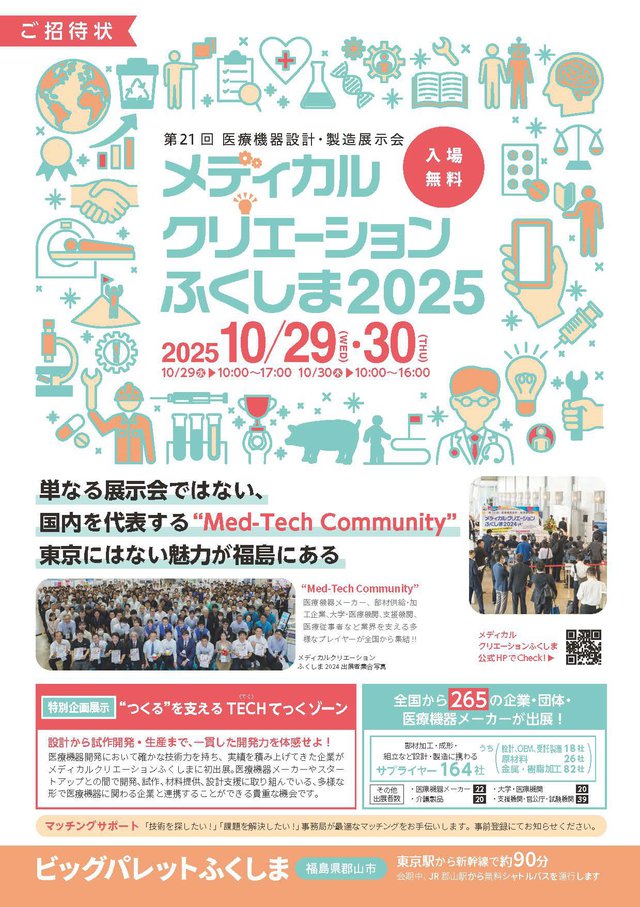 福島県では、医療機器分野への新規参入促進を目指して、2005年から県内製造業の高い技術力に着目し、「次世代医療産業集積プロジェクト」を推進しています。東日本大震災後は、復興計画の重点プロジェクトの1つとして、医療機器産業の一層の集積を掲げており、その柱が「医療機器設計・製造展示会 メディカルクリエーションふくしま」です。