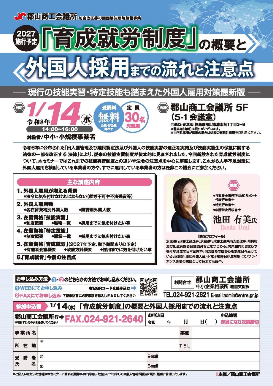 ①上記「申込方法」のURLから必要事項をご入力いただくか、またはチラシ下部に必要事項をご記入いただきFAXでお送りください。