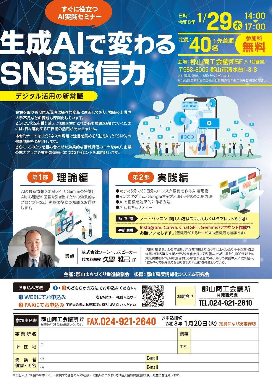 郡山まちづくり推進協議会では、生成AI実践セミナーを開催いたします。