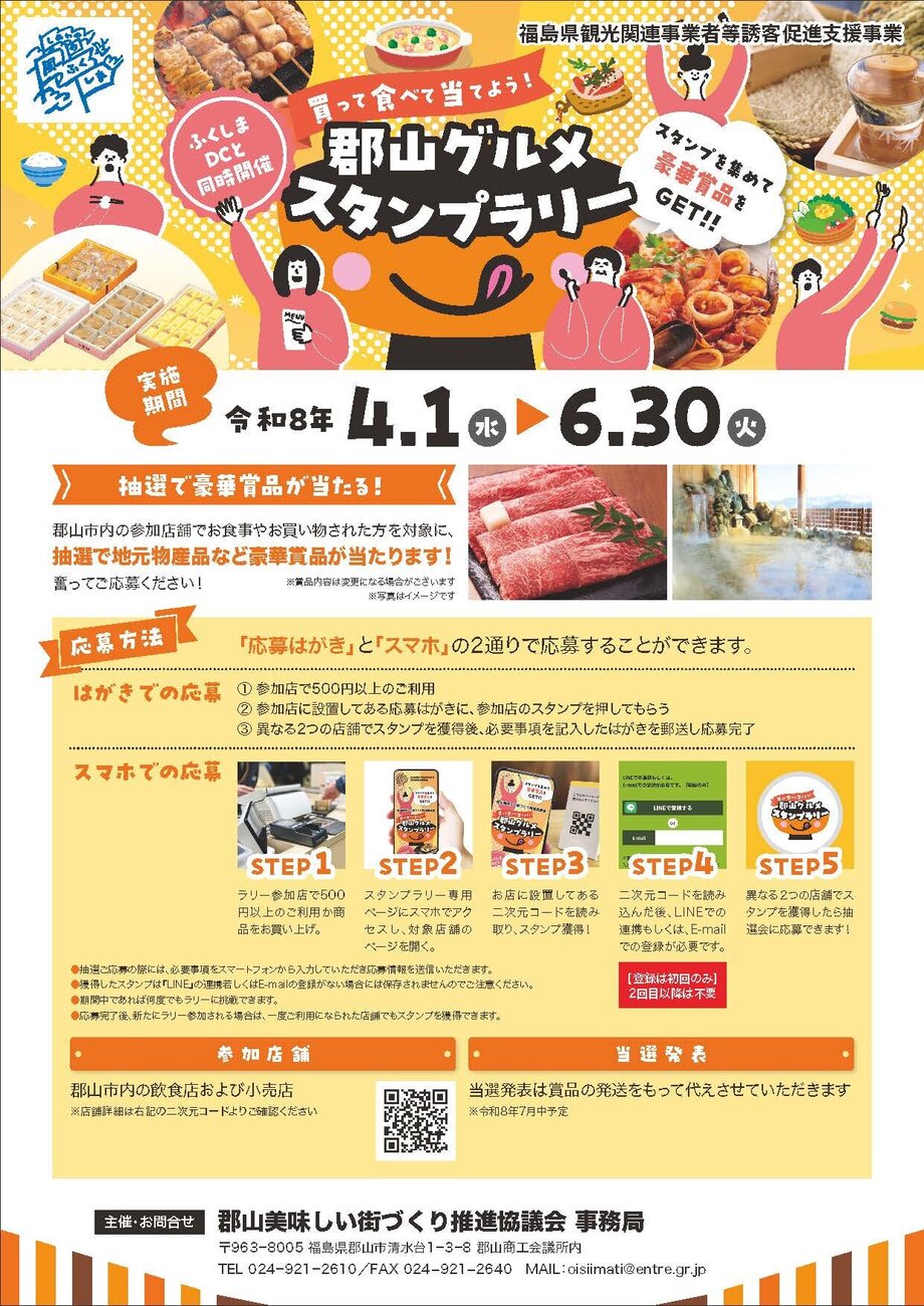 郡山美味しい街づくり推進協議会では、ふくしまデスティネーションキャンペーンに合わせて、郡山市内の飲食店や小売店を巡るスタンプラリーを実施いたします。ぜひ奮ってご応募ください!